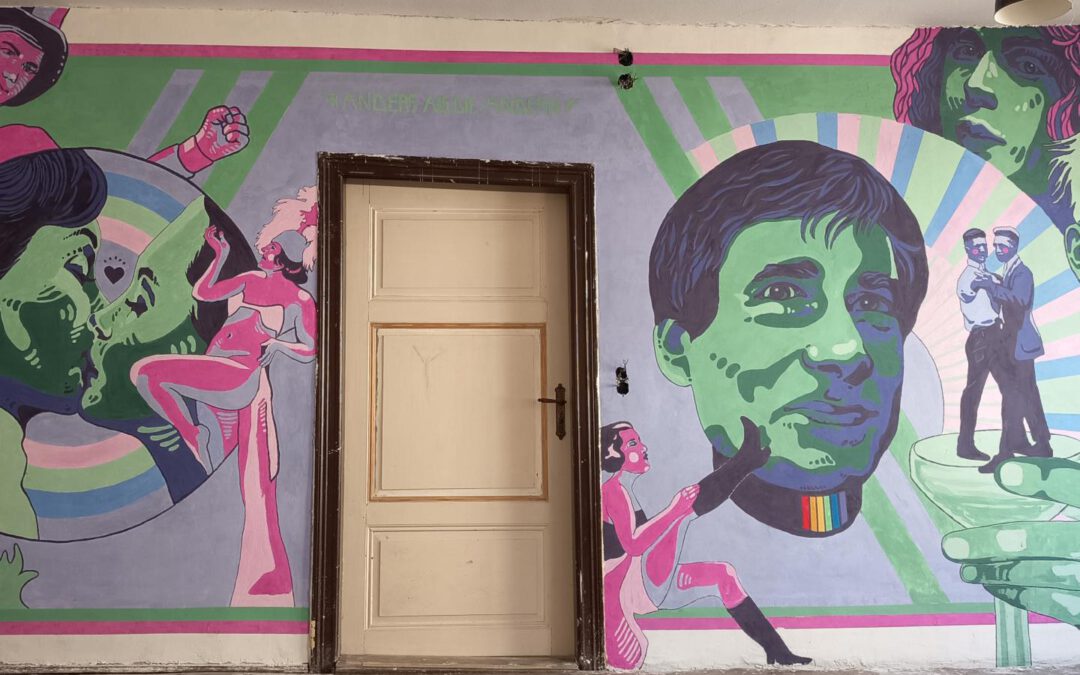 Unser Wandbild für den Szene Raum wurde in der Kultur-Nische am 13. September zu Wagen & Winnen mit dem Chaos Szene Dance feierlich eröffnet. Es war ein tolles gemeinschaftliches Projekt und wir haben es tatsächlich geschafft den Entwurf von Anne Schäfer auf die fast 6 m breite Wand zu bringen. Mein erstes Wandprojekt in dieser Größe. Es zeigt queere Persönlichkeiten aus Ostdeutschland mit außergewöhnlichen Lebensläufen unter anderem Eduard Stapel, Lilly Elbe und Magnus Hirschfeld. Umgesetzt wurde es mit selbst hergestellten Kreide Casein Farben. Es haben Menschen mit unterschiedlichen künstlerischen Vorerfahrungen mitgemacht.
